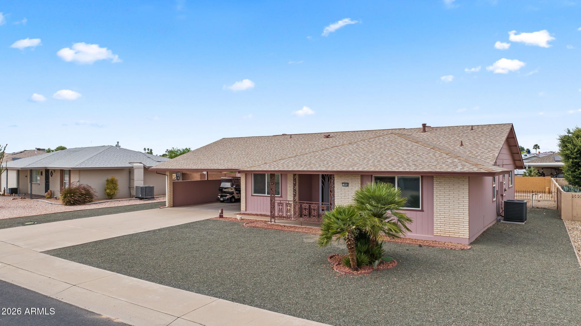 Welcome to Sun City living near the Sundial Rec Center, with access to a total of 7 rec centers and 8 golf courses. This well-maintained home features a huge living room, very spacious primary suite, and sizeable secondary bedroom as well. Home also includes fresh interior paint (2026), and new carpet in bedrooms (2026). Other key updates include HVAC (2022) and new hot water tank (2026). Enjoy covered patios in both the front and back with ideal north/south exposure. Spacious laundry room also provides room for crafting, or other hobbies. 2-car carport with attached golf cart garage (could also be perfect for storage or workshop). Large backyard offers endless possibilities (grass, turf or pool?) to create your ideal outdoor space. Living in Sun City means more than just owning a home--its access to an active, social lifestyle with endless opportunities. From golf and fitness to clubs, crafts, and community events, theres truly something for everyone. Whether youre enjoying a morning round of golf, an afternoon at the rec center, or a sunset on your patio, this is Arizona living at its best.